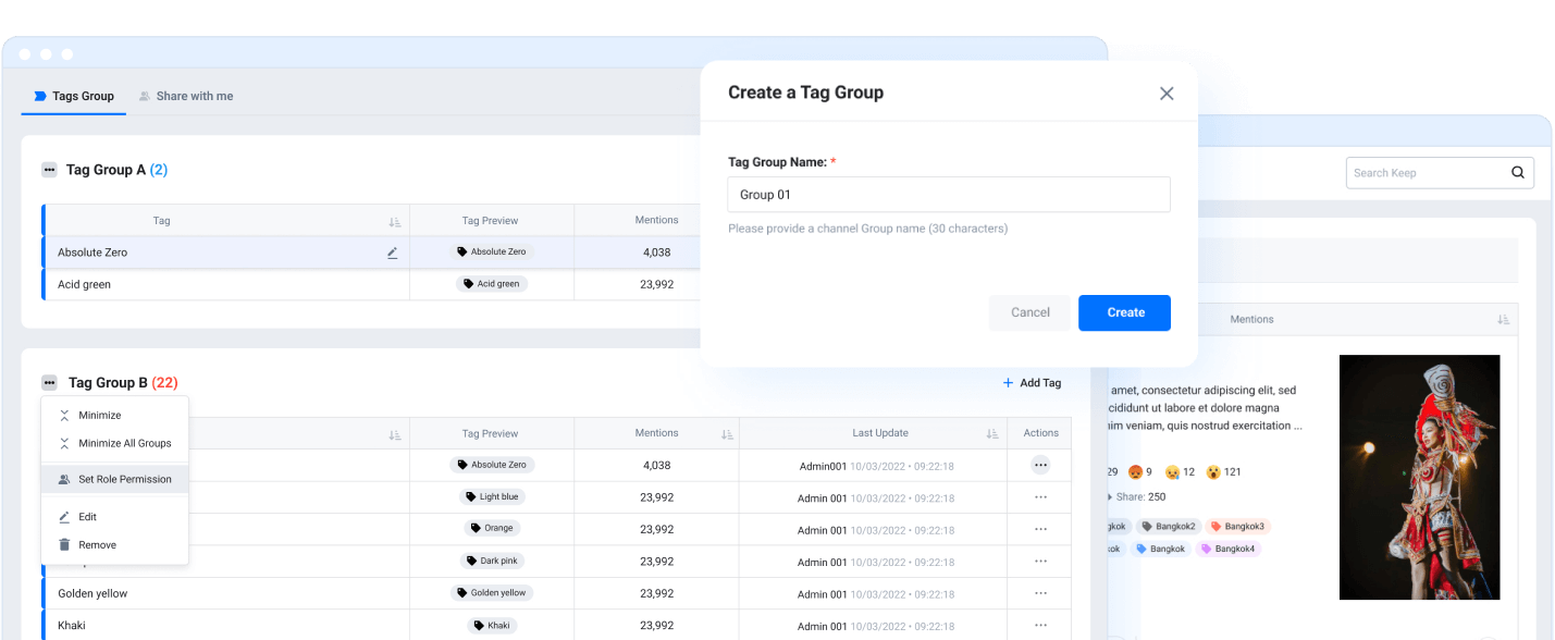 Group relevant mentions under the same tags and groups to easily share them with teammates.